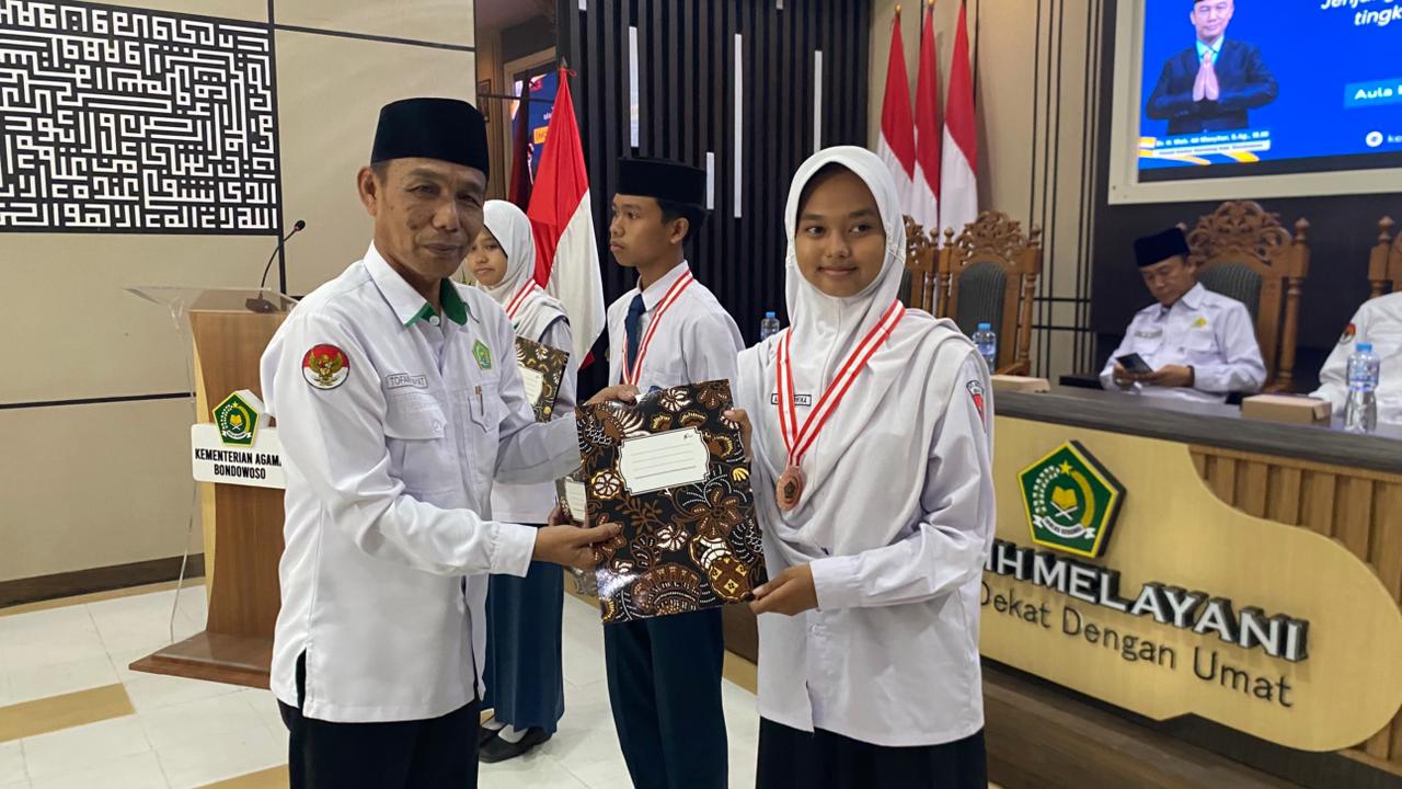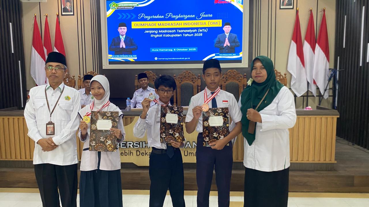 Bondowoso (Inmas) – Gelaran Olimpiade Madrasah Indonesia (OMI) Tahun 2025 tingkat MTs/SMP resmi ditutup dengan penuh semangat dan makna mendalam. Acara penyerahan penghargaan bagi para juara berlangsung di Aula Kantor Kementerian Agama Kabupaten Bondowoso, Senin (6/10/2025). Kegiatan ini dihadiri oleh para peserta, guru pendamping, serta pejabat di lingkungan Kemenag Bondowoso.