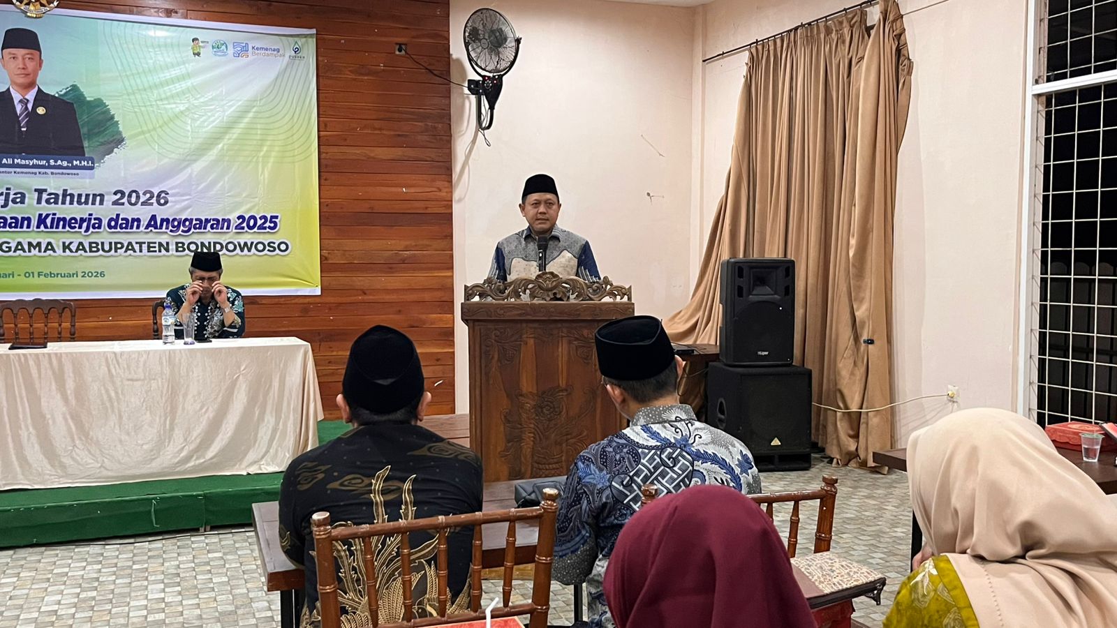 Jember (Inmas) — Arah kebijakan Kementerian Agama Tahun 2026 ditegaskan dalam pembukaan Rapat Kerja Kantor Kementerian Agama Kabupaten Bondowoso yang secara resmi dibuka oleh Kepala Bagian Tata Usaha Kantor Wilayah Kementerian Agama Provinsi Jawa Timur, H. Syaikhul Hadi, S.Ag, M.Fil, di Aula Dira, Kencong, Kabupaten Jember, Jumat (31/1/2026). Rapat kerja ini menjadi momentum penyelarasan kebijakan pusat dengan perencanaan program di tingkat daerah.