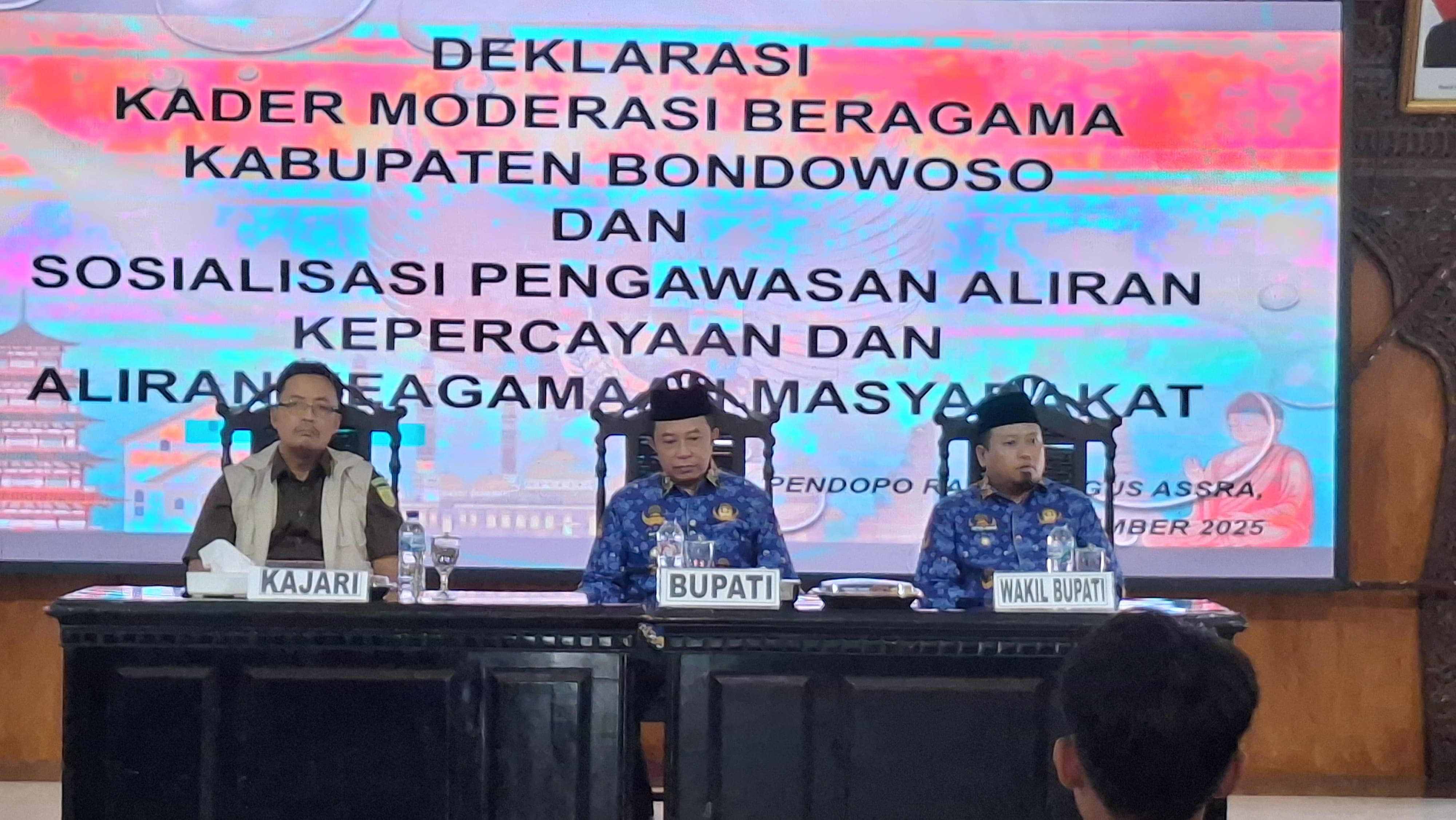 Bondowoso (Inmas)– Pemerintah Kabupaten Bondowoso menggelar Deklarasi Kader Moderasi Beragama sekaligus Sosialisasi Pengawasan Aliran Kepercayaan dan Aliran Keagamaan Masyarakat (PAKEM) di Pendopo Bupati, Senin (17/11). Agenda ini menjadi bagian dari upaya pemerintah daerah memperkuat toleransi, meningkatkan deteksi dini, serta menjaga keharmonisan sosial di tengah masyarakat yang majemuk.