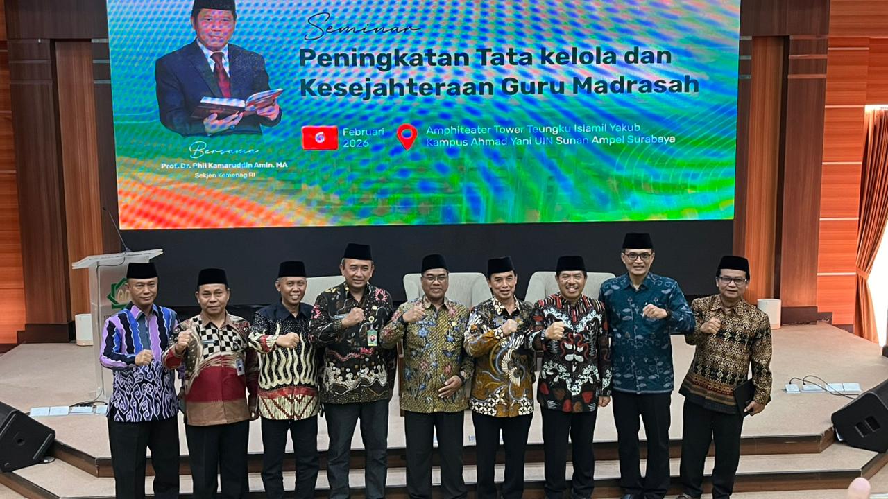 Surabaya (Inmas) — Kepala Kantor Kementerian Agama Kabupaten Bondowoso menghadiri seminar bertajuk Peningkatan Tata Kelola dan Kesejahteraan Guru Madrasah yang digelar di Amphiteater Tower Teungku Ismail Yakub, Kampus UIN Sunan Ampel (UINSA) Ahmad Yani, Surabaya, Jumat (6/2/2026).