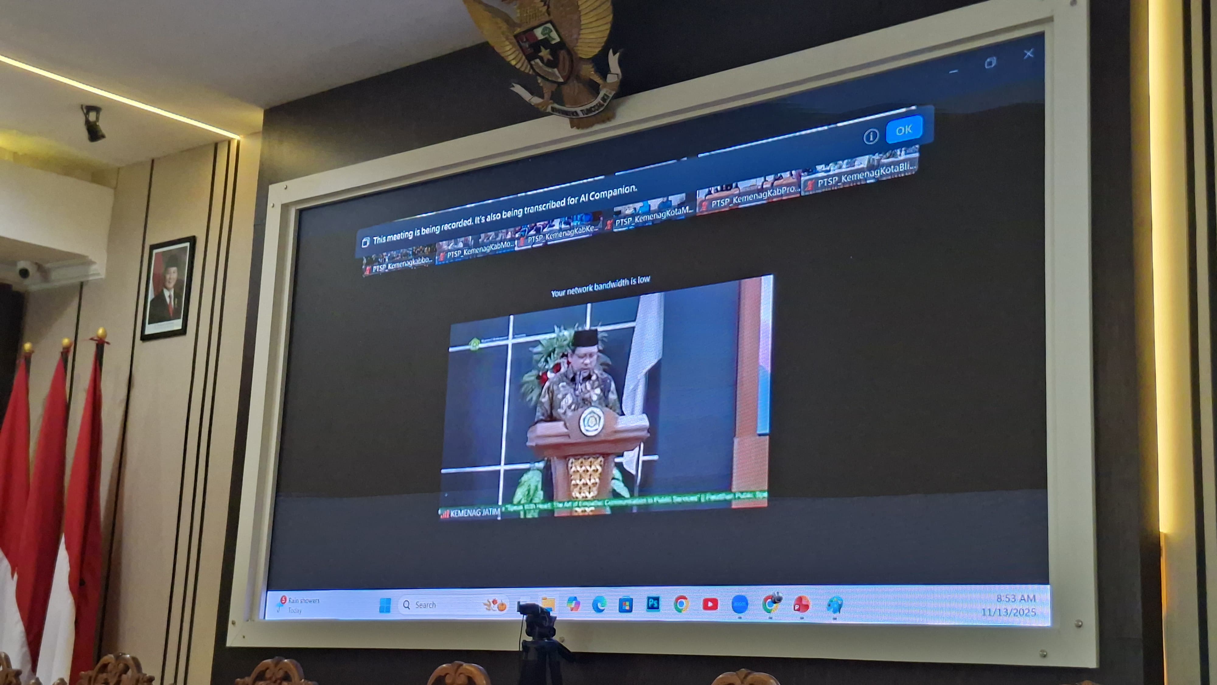 Bondowoso (Inmas) – Aula Kantor Kementerian Agama Kabupaten Bondowoso, Kamis (13/11), menjadi ruang refleksi pelayanan publik yang hangat. Kepala Kantor Kemenag Bondowoso Moh. Ali Masyhur bersama Kasubbag TU menghadiri kegiatan Pelatihan Public Speaking bagi Penyelenggara Pelayanan Terpadu Satu Pintu (PTSP) yang digelar secara daring dari Kantor Wilayah Kemenag Provinsi Jawa Timur.