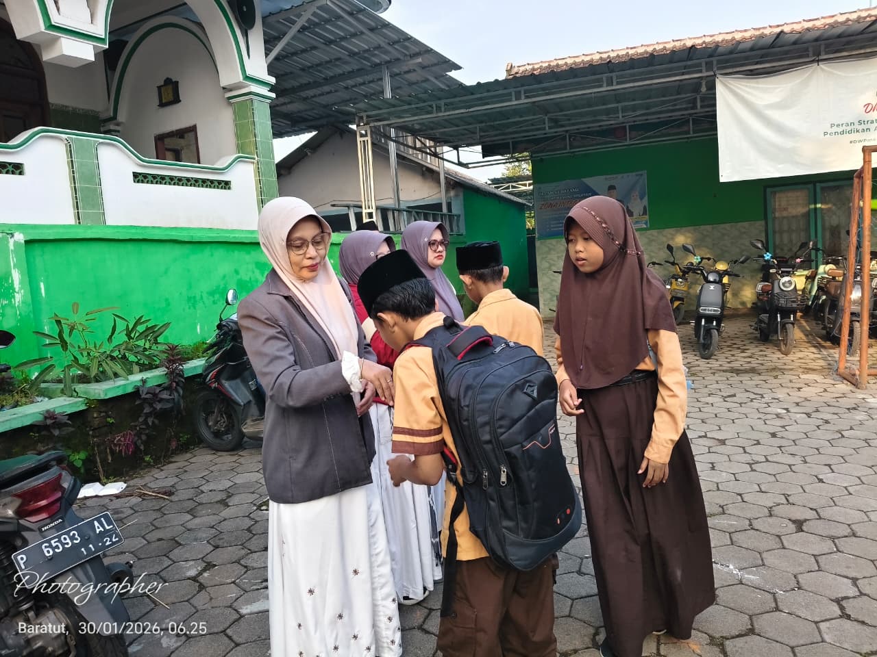 Kegiatan diawali dengan GEMAS (Guru Menyambut Siswa-Siswi). Sejak gerbang madrasah dibuka, para guru menyambut kedatangan siswa dengan salam, senyum, dan sapaan hangat. Pembiasaan ini menjadi bentuk pendekatan emosional yang bertujuan menciptakan rasa aman, nyaman, dan dihargai pada diri peserta didik sejak awal hari.