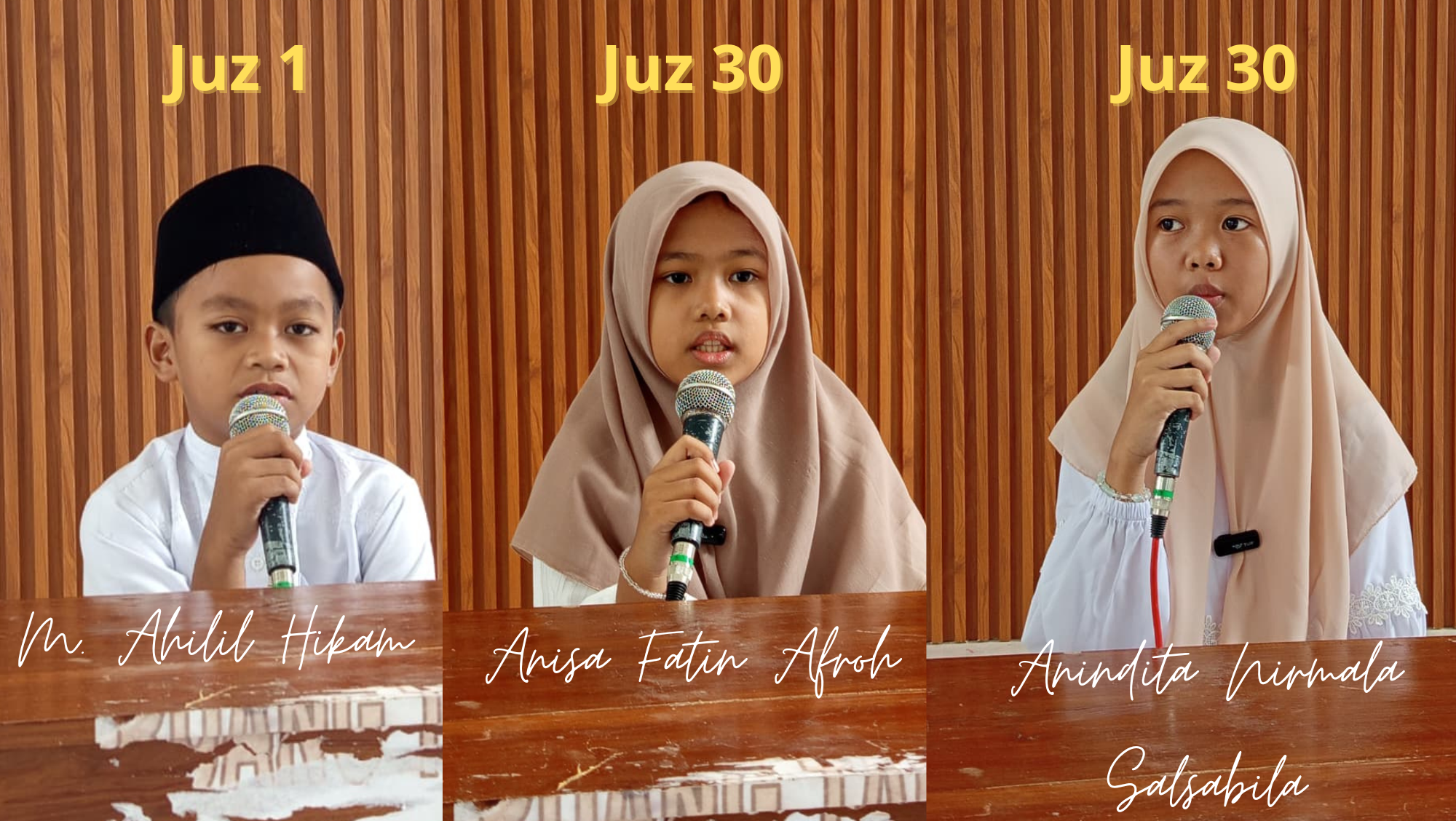 Mereka adalah Muhammad Ahilil Hikam kelas 4B yang mentasmi’kan Juz 1, Anisah Fathin Afroh kelas 5 Juz 30, serta Anindita Nirmala Salsabila kelas 5 Juz 30. Dengan suara lantang dan tartil, ketiganya melantunkan ayat demi ayat di hadapan guru, penguji, serta jamaah yang hadir.